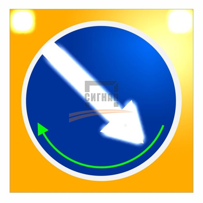 Главное отличие данного знака - наличие поворотное стрелки на щите, что позволяет изменить направления объезда не снимая сам знак. Это очень удобно при монтаже стрелки на спецтехнику.